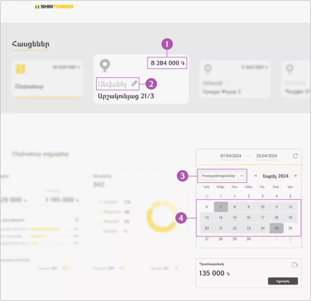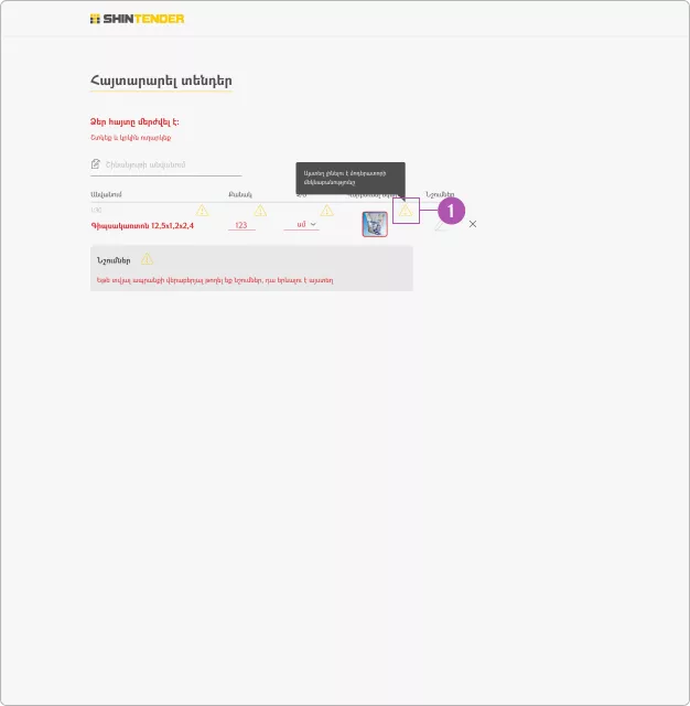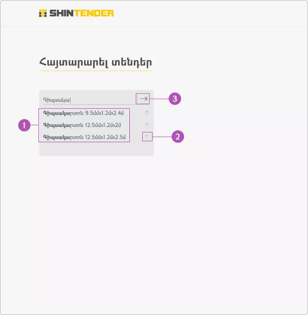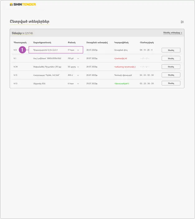 Տենդերը փոխանցելու մանրամասները՝ “2. Տենդերի հայտարարում” կետի 4-րդ էջում։Այս բաժնում կհայտնվեն Ձեր կողմից հայտարարված տենդերները, որոնցում գնառաջարկ դեռ չեք ընտրել