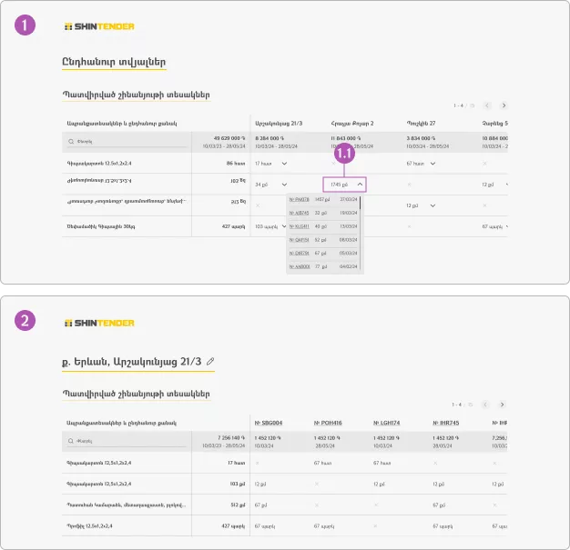 1.1 Եթե նույն հասցեով նույն շինանյութից ձեռք եք բերել մեկից ավելի անգամ, ապա սեղմելով նշված հատվածին, կարող եք տեսնել՝ երբ է առաքվել, որքան և տվյալ տենդերի համարը։