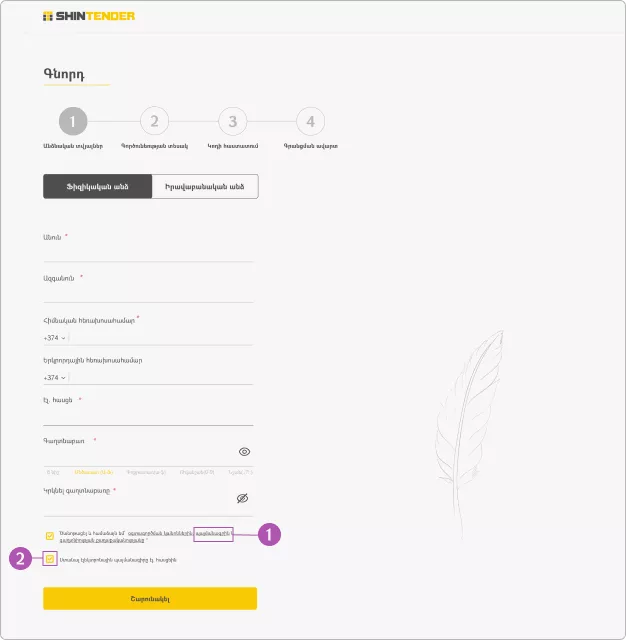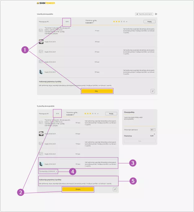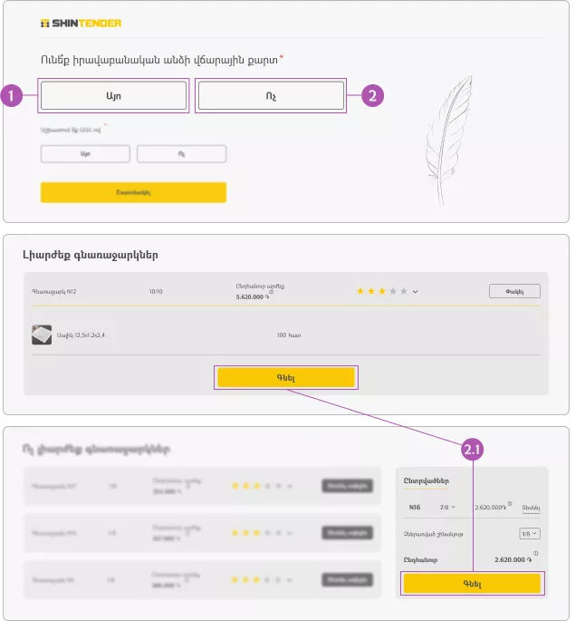 2.1. Փոխանցման համար անհրաժեշտ իրավաբանական տվյալները կտեսնեք գնառաջարկ ըմտրելուց հետո՝ սեղմելով "Գնել" կոճակին։