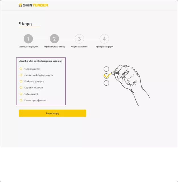 Նշեք Ձեր գործունեության տեսակը։ Այն հետագայում հնարավորություն կտա օգտվել տվյալ գործունեության տեսակի համար նախատեսված ֆունկցիոնալներից և հնարավորություններից։