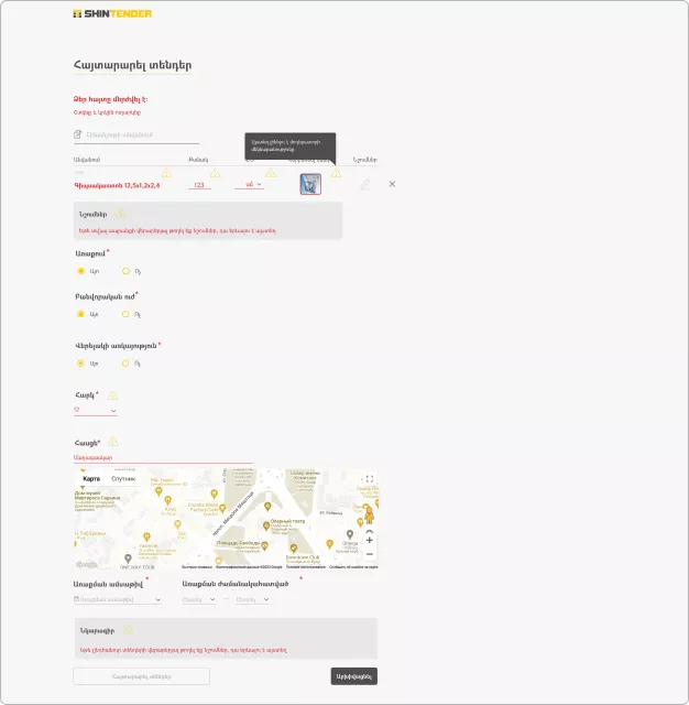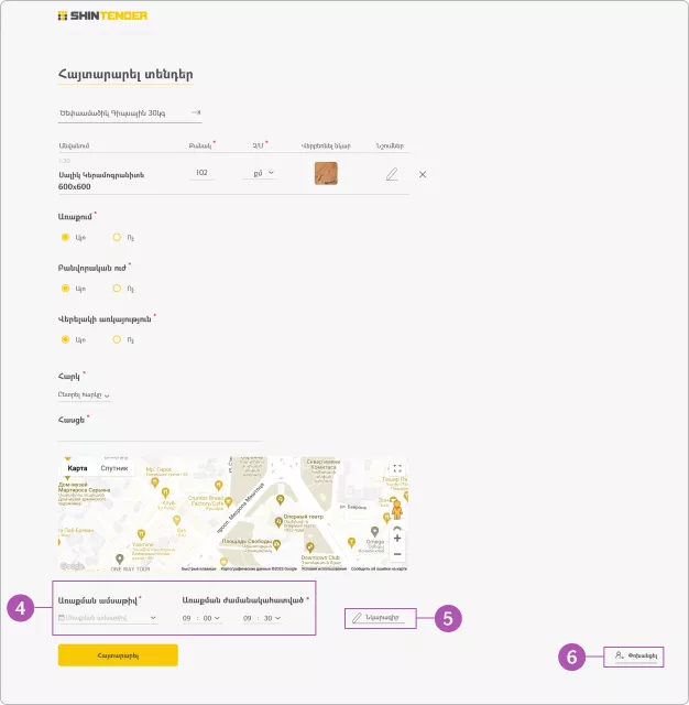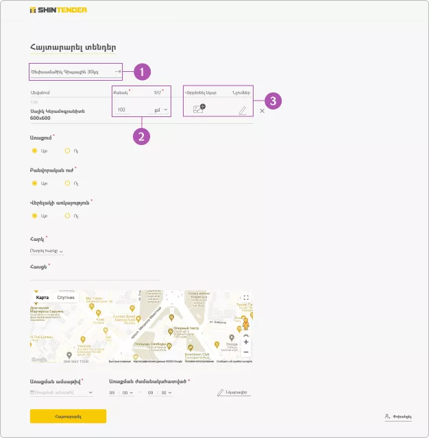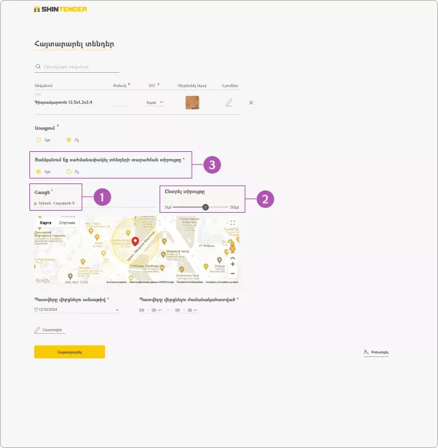 Եթե առաքման կարիք չունեք և պատրաստ եք ինքներդ վերցնել պատվերը, ապա առաքման դաշտում նշեք “Ոչ” տարբերակը, որի դեպքում համակարգը հնարավորություն կտա սահմանափակել տենդերի տարածման տիրույթը, որպեսզի գնառաջարկներ ստանաք Ձեզ առավել հարմար տարածքից։