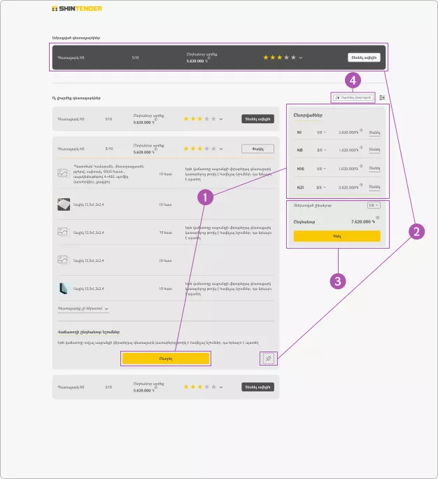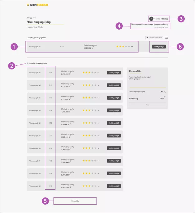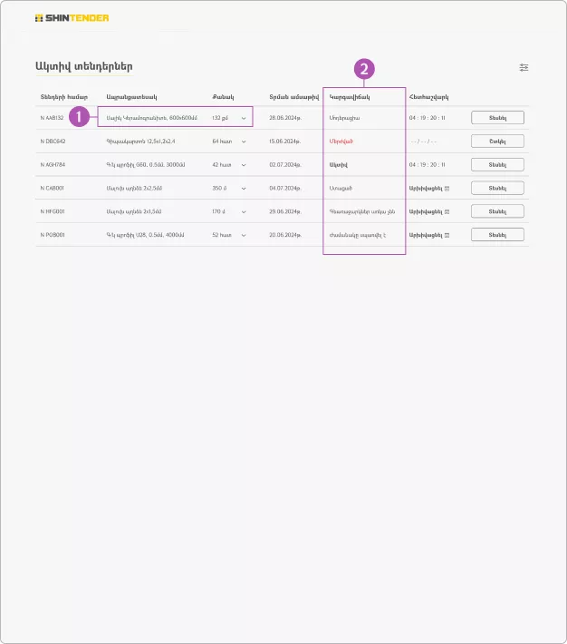 Ակտիվ - Կարող եք տեսնել գնառաջարկները, ընտրել լավագույն(ներ)ը կամ չեղարկել տենդերը,