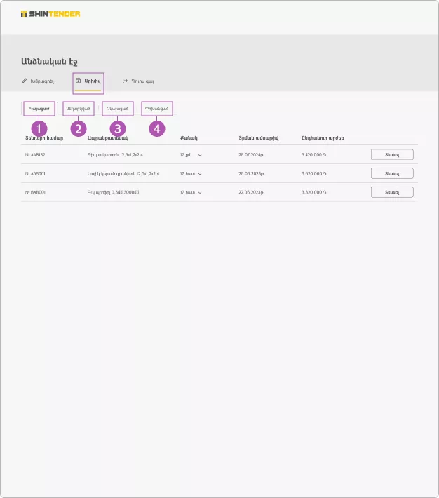 Այս բաժին կտեղափոխվեն Ձեր կամ համակարգի կողմից արխիվացված տենդերները։